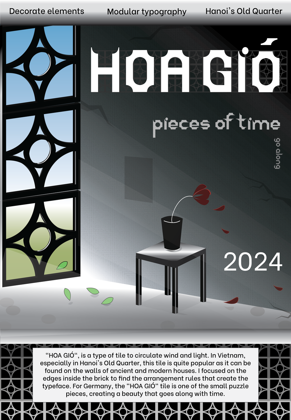 "HOA GIÓ" is a decorative typeface inspired by a type of tile found in the buildings of Hanoi old quanter. This is the name of a popular decorative tile during the French colonial period, often used to circulate wind and light. “HOA GIÓ” is a sans serif font that combines flexibility and solidity. This is a classic, nostalgic beauty that intersects two cultures, creating a beauty that will never be forgotten in Hanoi urban landscape.