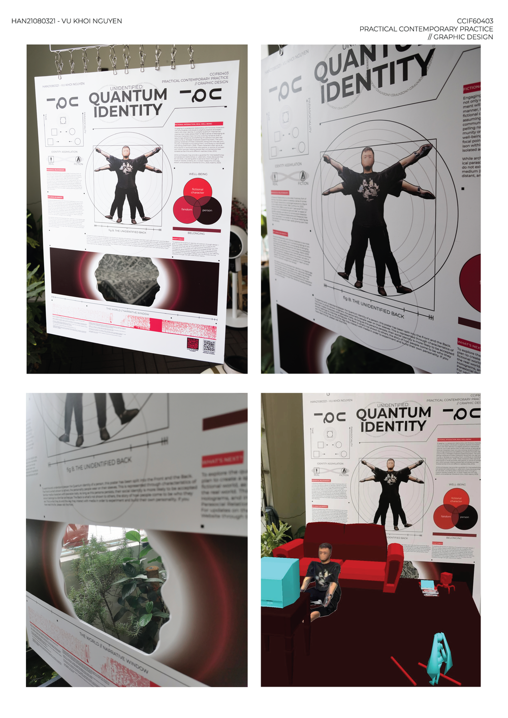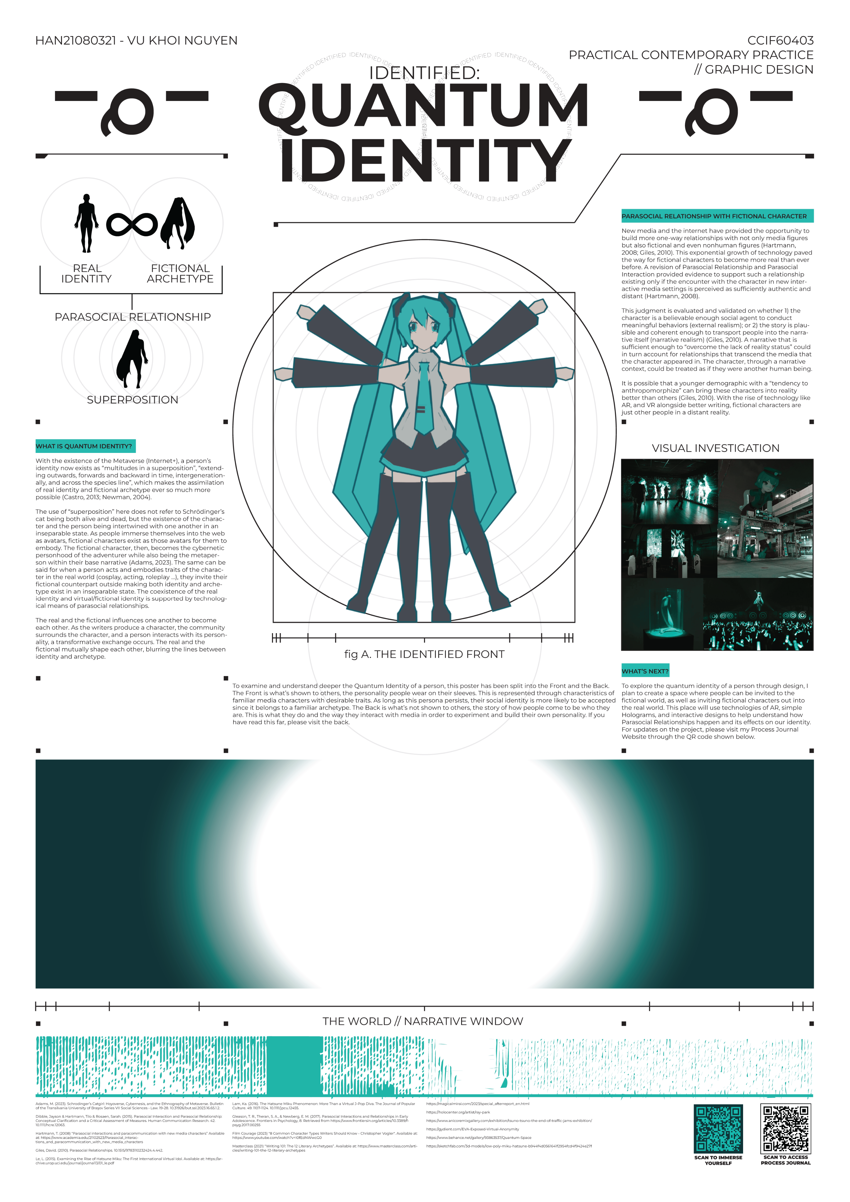 | The project explores the quantum identity of a person through design. The space will be created to invite people into a frictional world, as well as inviting a fictional characters out into the real world. The project explores the use technologies of AR, simple holograms and interactive designs to help understand how Parasocial Relationship happen and its effects on our identity. |